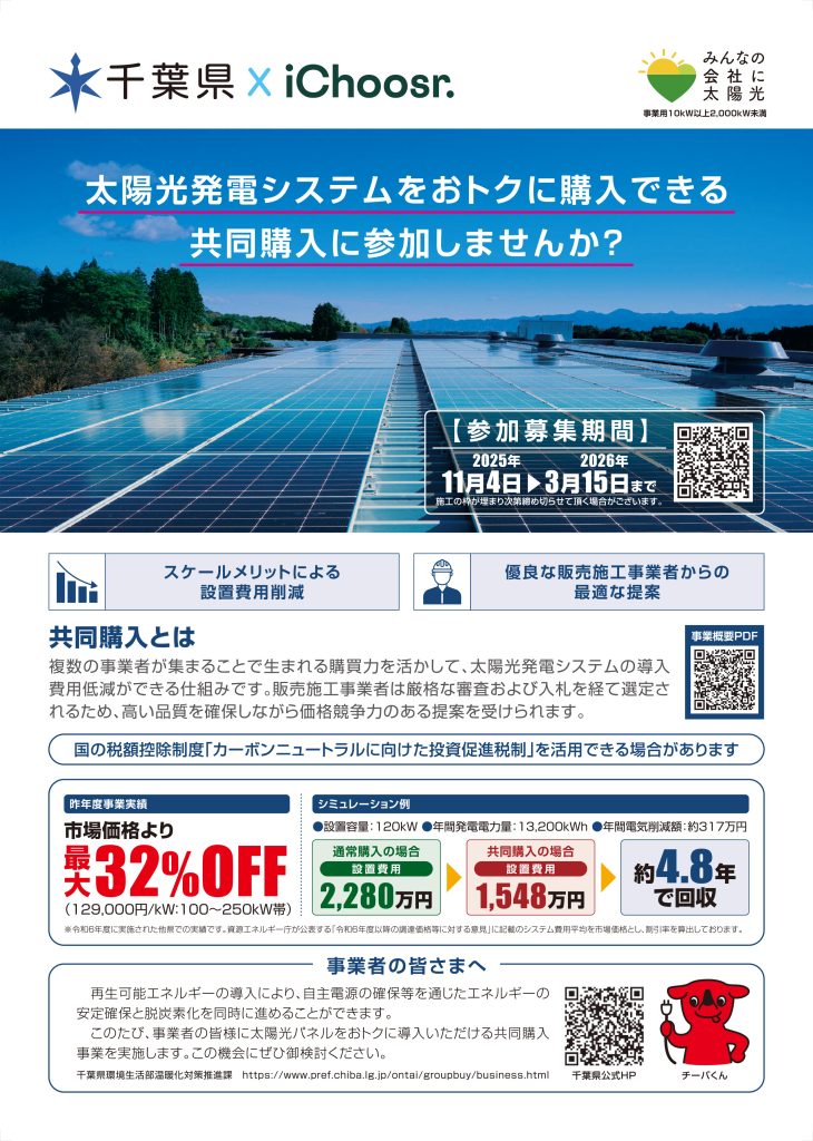 現在、千葉県では、事業者向けの太陽光パネルをみんなでおトクに購入する共同購入の参加者を募集しています。