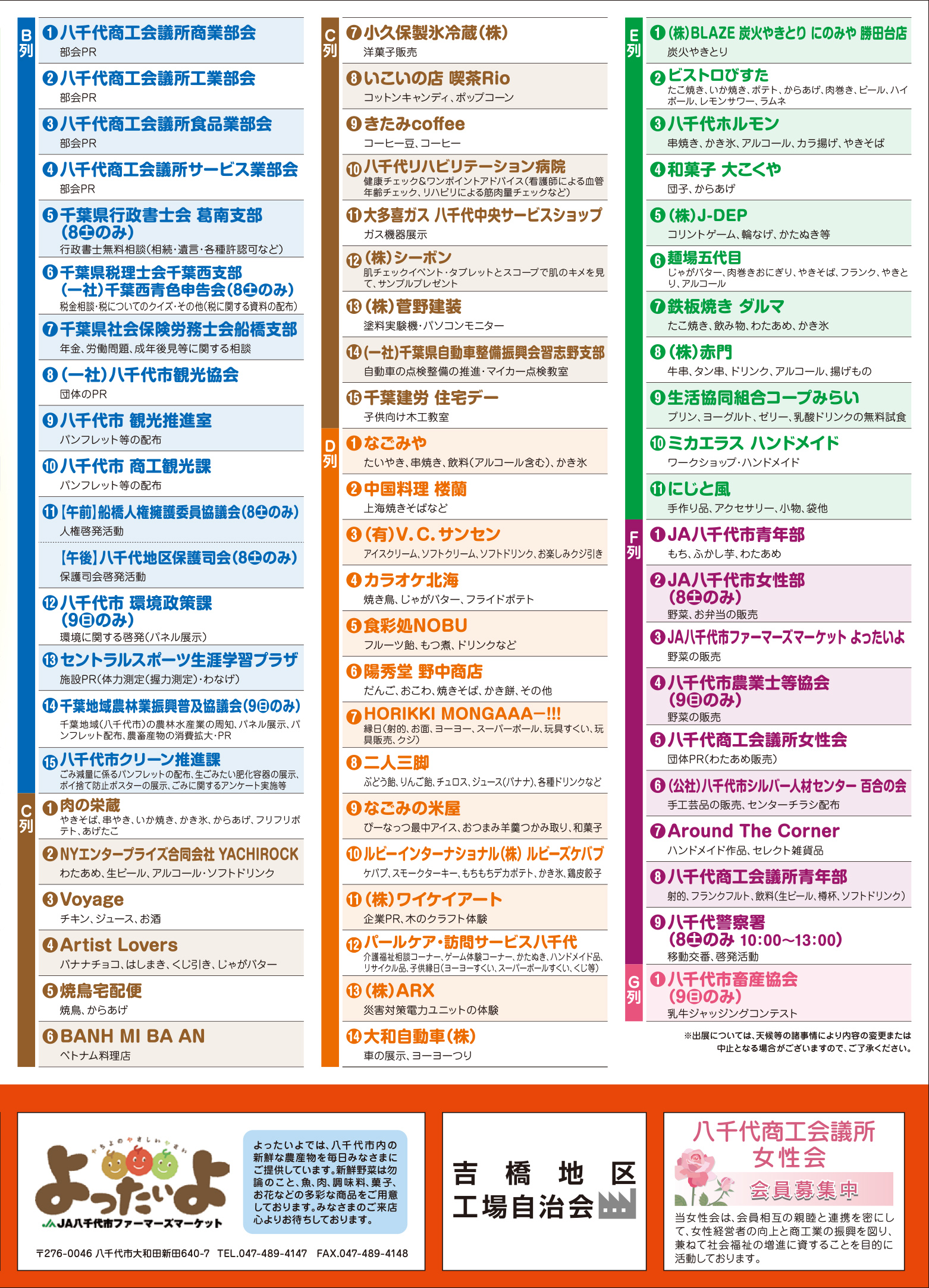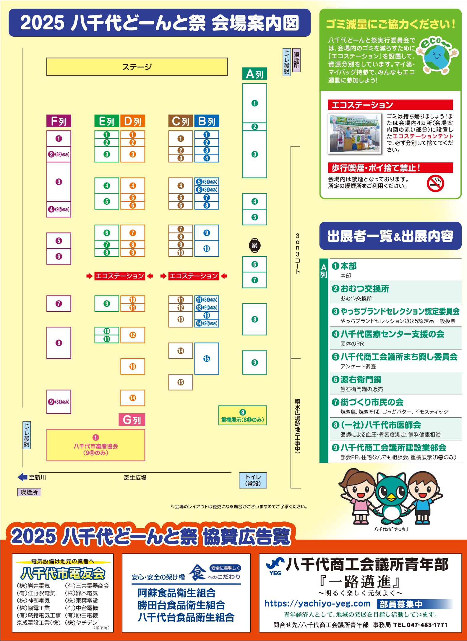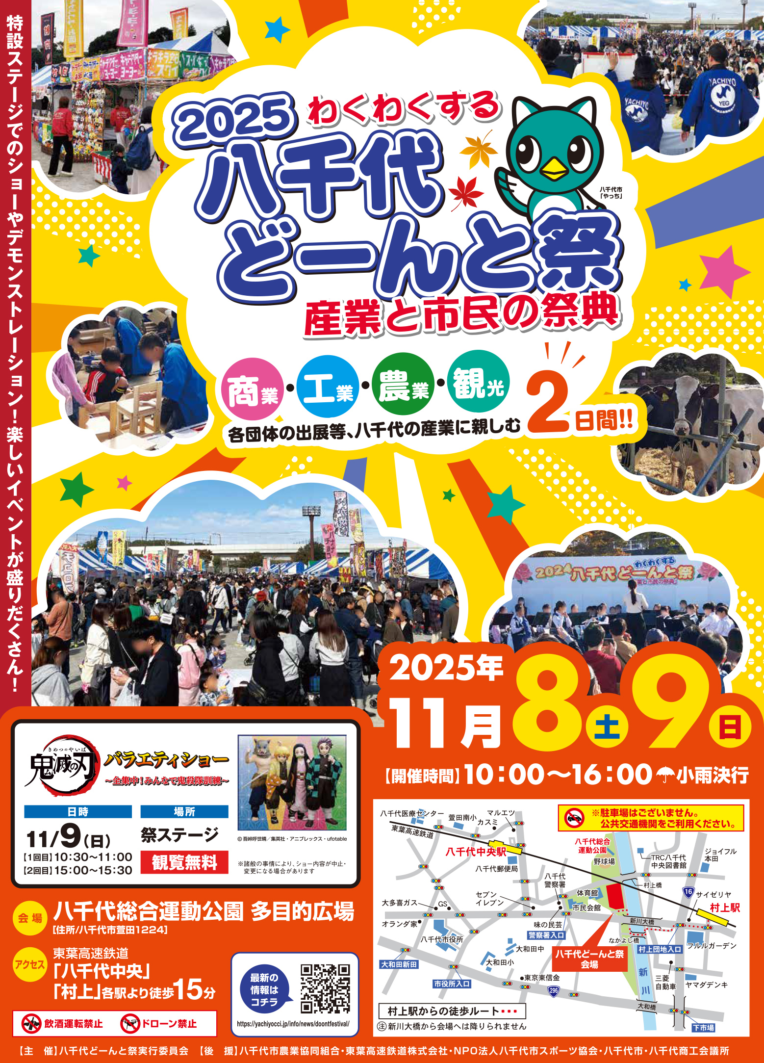 2025.11.09 イベント 【中止決定9日(日)】2025八千代どーんと祭開催! どーんと祭中止のお知らせ 本日(9日)予定しておりました「八千代どーんと祭」は、雨天により、中止とさせていただきます。 開催日・場所 【日時】令和7年11月8日(土)、9日(日)【場所】八千代総合運動公園多目的広場 駐車場はございません。ご来場には公共交通機関をご利用ください。 チラシのダウンロードはこちら(PDF形式) チラシのダウンロードはこちら(PDF形式) 詳細な情報は随時更新いたします。