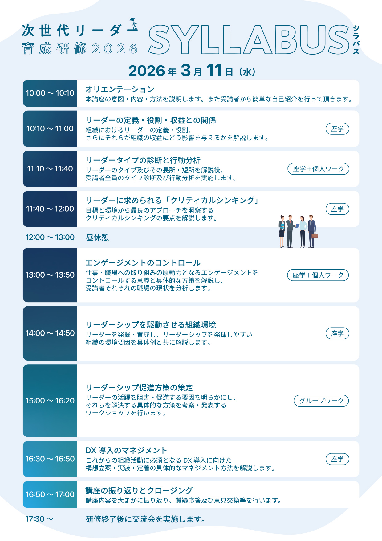 2026.01.20 お知らせ 次世代リーダー育成研修2026 若手・中堅社員を対象に、リーダーとして求められる考え方や行動力を学ぶ実践型研修です。講義だけでなく、演習や意見交換を重視し、現場で直ちに活かせる力の習得を目指します。お申込方法はページ最下段より。 本イベントは【各商工会議所の会員限定】のサービスです。 【お申し込み方法】 2月27日(金) までに、以下のお申し込み専用フォームにご入力下さい。 次世代リーダー育成研修2026お申込フォーム