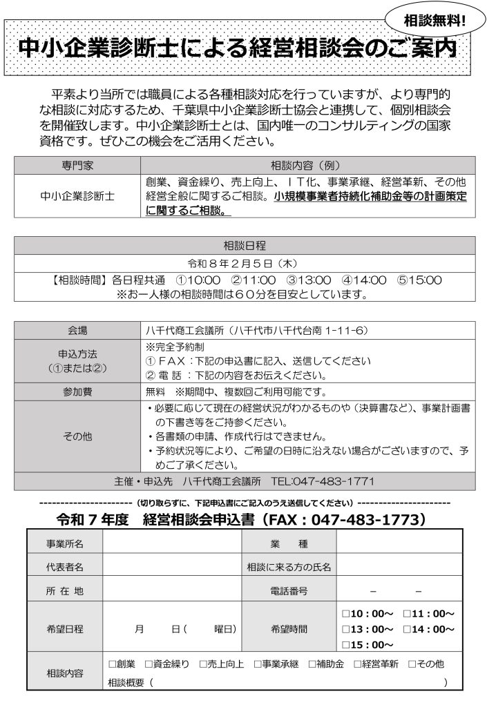 受付中 2月5日(木) 10:00 ~ 16:00 2月5日(木)実施中小企業診断士による経営相談会 申込みはチラシをダウンロードし、項目にご記入のうえ八千代商工会議所までFAX(047-483-1773)をお送りいただくか、メール(info@yachiyocci.jp)にてお送りください。